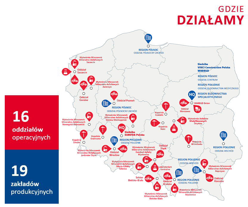 Holding obecny jest w całej Polsce za sprawą 16 oddziałów operacyjnych i 19 zakładów produkcyjnych tj. wytwórnie mas bitumicznych, kopalnie kruszyw czy spółka WARBUD Beton.